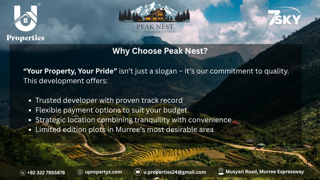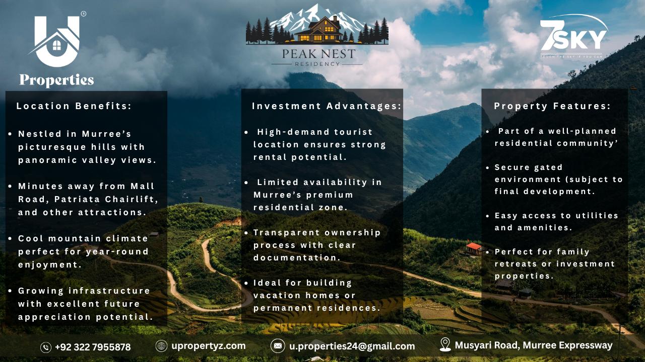 Peak Nest Residency is a premier on-ground residential plot community near Murree Expressway, Masayari Road. It offers 3, 4, and 5 marla plots with confirmed allocation, plot selection via map, and Intakal Registry at booking for full transparency.